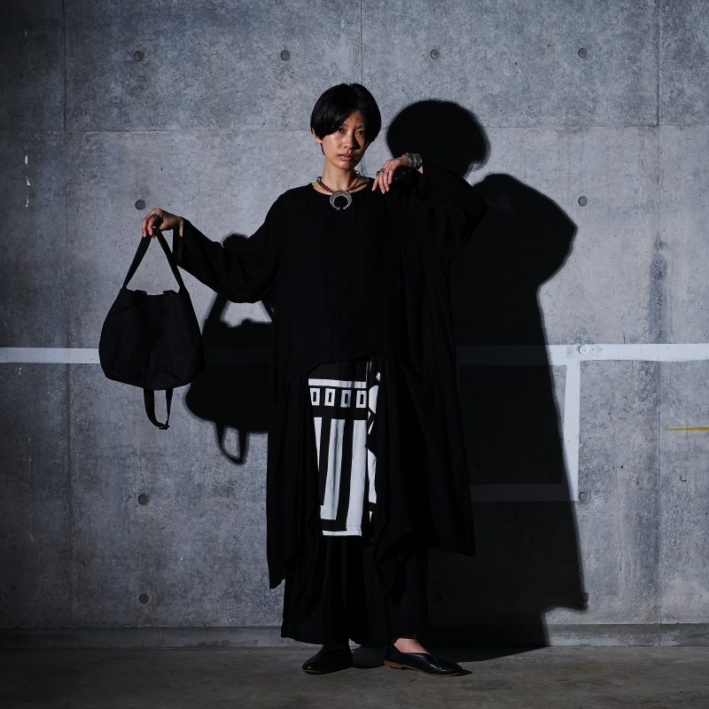 直線と幾何学模様が織りなす存在感のあるデザインです。無地のブラックと合わせることで、